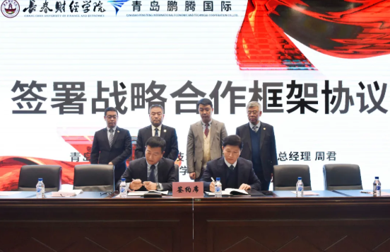 青島鵬騰國際經(jīng)濟技術(shù)合作(集團)有限公司總經(jīng)理周君與長春財經(jīng)學(xué)院董事長李樹峰代表學(xué)校簽署合作協(xié)議。